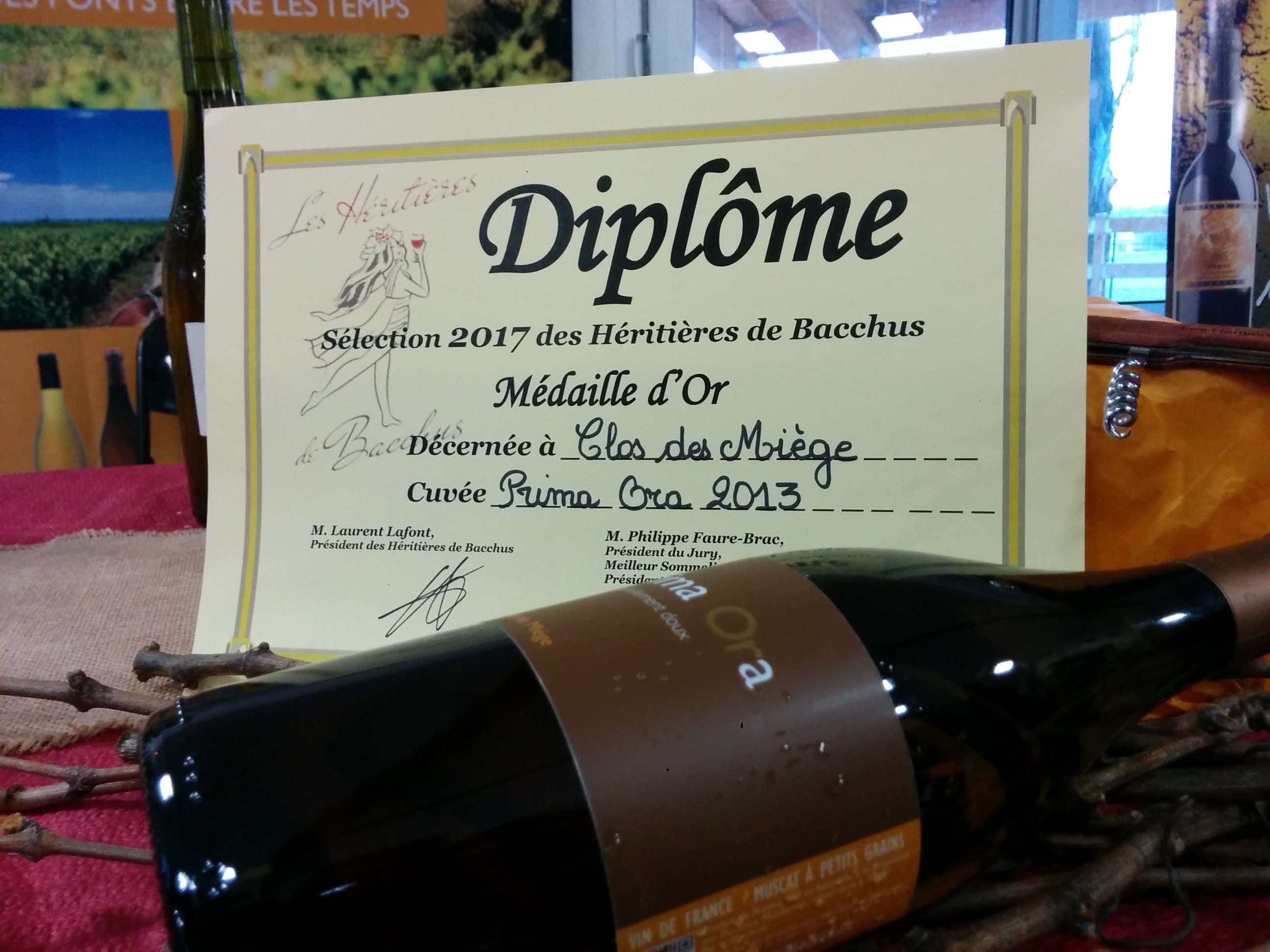 Un billet d’octobre dernier parlait ici du « Muscat autrement », des vendanges atypiques aux Clos de Miège. Ce travail patient, l’exigence apportée à l’élaboration des cuvées, leur ancrage dans une histoire et un patrimoine, en production naturelle, est présenté tous les ans aux Héritières de Bacchus, à Claret. Le 12 mars, la cuvée Prima Ora 2013 concourait à la Sélection de ce salon hors du commun, mis sur pied en 2015 par un fou de vins, Laurent Lafont, en 2015 célébrer les femmes vigneronnes du Languedoc et maintenant de toute la France. La cuvée a reçu la Médaille d’Or dans la catégorie « Autres vins ». Surprise, sans voix, et beaucoup d’émotion encore pour la partager ici.