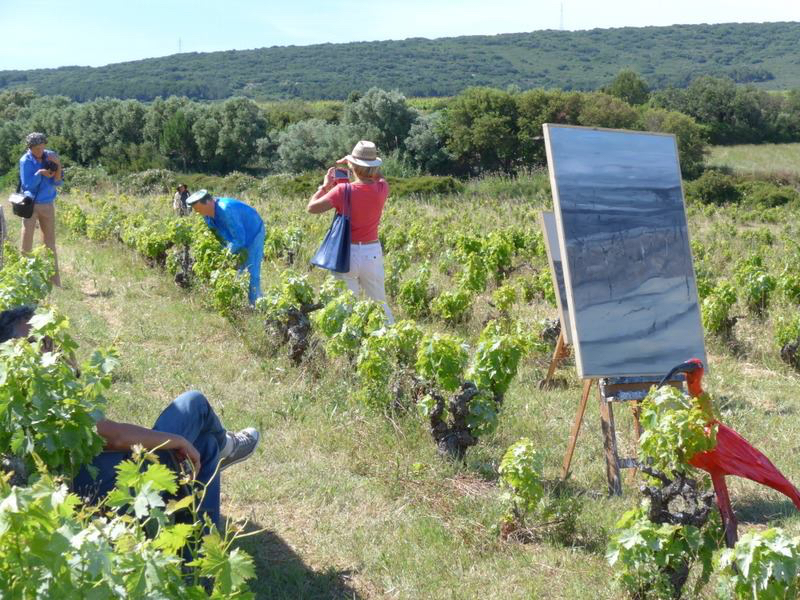 Le parcours artistique a animé les vignes, y insufflant poésie et élan créatif, surprenant les visiteurs dès leur arrivée, interpellant leur curiosité, leur amour de la nature ou d’arts minutieux. Dans la continuité des grandes installations de Magali Sablier, Joël Bast et Evy Grandrie, une seconde partie, plus intimiste, a rassemblé sculptures en grès chamotté de Brigitte Boursereau, dessins de Florence H, collages de Florence Rieu autour de bouteilles et autres contenants du vin, ainsi qu’une création d’Isabelle Piron sur la cuvée L’Originel des Clos de Miège. Le « vernissage » à ciel ouvert a pris soin de bathintroniser le Claude de Miège, personnage qui « taille la vigne, travaille dur » et vient m’épauler, selon son créateur, Joël Bast. Le dialogue ainsi établi entre arts et vins, les dégustations de breuvages biologiques régionaux se sont succédées, suscitant affluence et intérêt pour des pratiques saines. Questions et éclairages sur les conduites à la vigne et en cave ont balayé le spectre des différents choix des vignerons, et de caves coopératives, de la certification en vins biologiques jusqu’aux méthodes alternatives en biodynamie, très poussées dans leur exigence avec les méthodes sans soufre ajouté, vegan ou Bee friendly (amical avec les abeilles). L’accord avec les mets bio du food truck, présent malgré un accident peu avant son arrivée, a sublimé vins blancs, rosés et rouges proposés, illustrant par l’exemple toutes les saveurs et les arômes révélés par des conduites en mode biologique. La cuvée Prima Ora des Clos de Miège récemment médaillée s’est mariée dans de belles harmonies avec des desserts qui ont rallié tous les suffrages. Une note d’émotion pour moi que de voir mes vins dégustés tout à côté des grappes à peine formées, promesse d’une nouvelle récolte du précieux nectar.