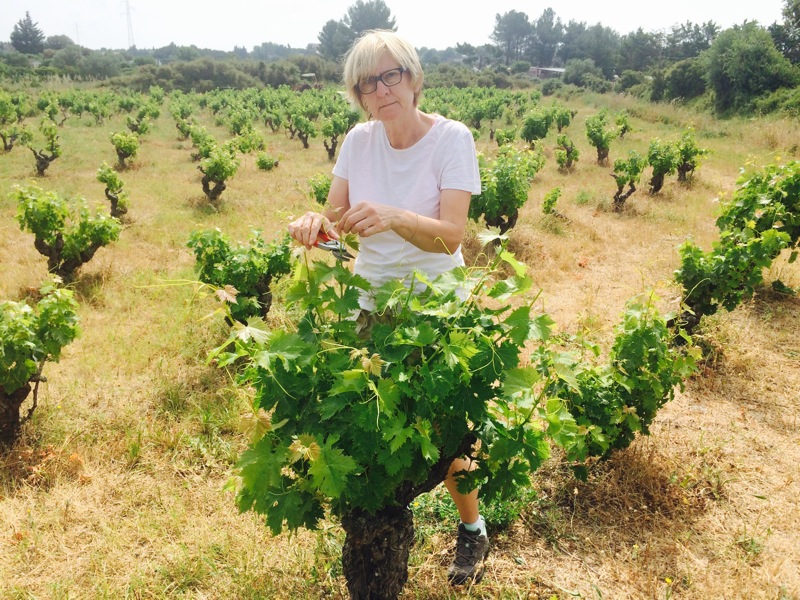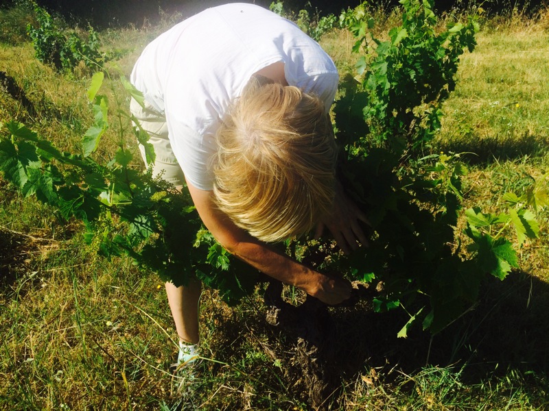 En culture biologique, naturelle, les barrages sont d’abord et avant tout préventifs. Ayant repéré les années précédentes les points de départ de la maladie, nous soignons les feuilles avant l’apparition de signes. Nous travaillons dans le même temps à créer des conditions sanitaires optimales. Le mildiou attaquant par les feuilles basses, le tour du pied requiert notre attention. Un grand nettoyage déloge les plantes parasites rebelles et ne laisse aucune herbe concurrente à la vigne. L’épamprage et l’écimage mobilisent nos mains pour finir de donner force et vigueur dans tout le bois. Epamprer, c’est d’abord se courber –beaucoup !- pour enlever les repousses sur le tronc et les « gourmands », rameaux sans raisin ravissant la sève, et laisser le champ libre au développement des branches porteuses de grappes. L’écimage étête les bouts de rameaux, plus sensibles aux maladies. La taille en vert, pratiquée pour la première fois cette année, parachève le travail de prophylaxie en aérant le feuillage, en particulier en son centre, source de foyers de maladies.