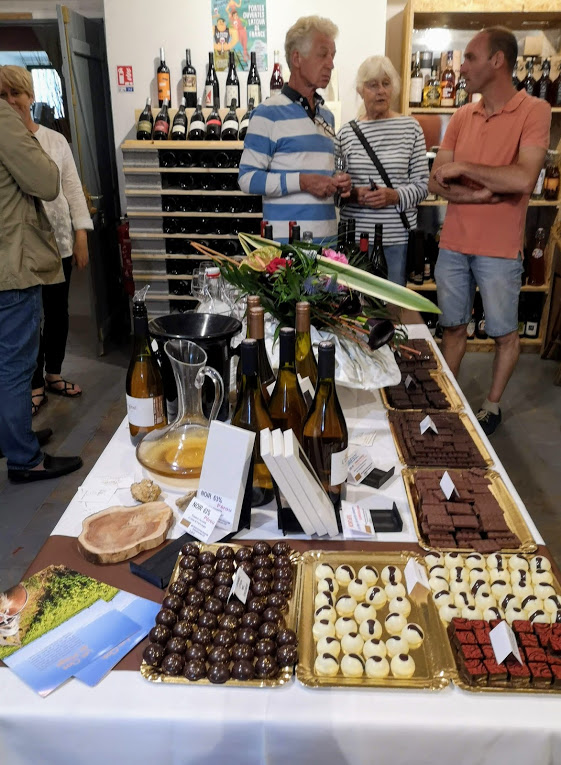 L’atelier de dégustation vins et chocolat organisé par Sandra Martinez à Alès, participe de la même veine: lieu frais et intimiste, chaleur humaine et désir de créer des liens de toutes natures, entre vins et chocolat avec le Maître-chocolatier Alfonso Cannarozzo, en compagnie d’autres vignerons, ici Frédéric Kchouk du Domaine de Coullorgues, et ses cuvées 100% Syrah, entre habitués et nouveaux amateurs. L’Originel accompagne à merveille un cru des Iles des Grenades 65%. Prima Ora, que le printemps émoustille, s’harmonise avec un cru d’exception sur un tout petit terroir, comme lui : un Venezuela Chuao 70%. Fermer les yeux et tout oublier…