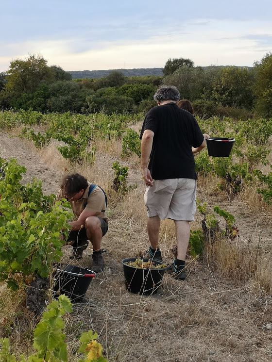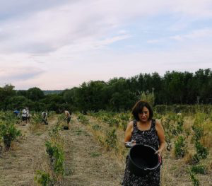 Vendanges du soir, espoir – qui plus est un vendredi 13-, nous sommes partis au soleil couchant cueillir les grains d’or, tambour battant (celui du jeune Lucas). Avec le hautbois, instrument symbolique des traditions occitanes, et le saxophone de Jean Alingrin, résonnent dans les rangs le chant de l’amitié, les rires et les encouragements de Claude de Miège, infatigable vendangeur, élu le meilleur de la colle[3], Bio Man, comme un poisson dans l’eau ici, et Ambre. Leur présence ne dit plus long que des mots.