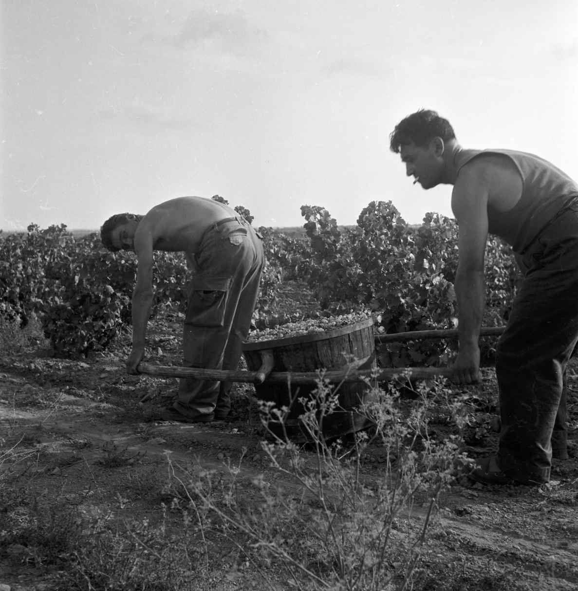 Alors qu’il délaisse la gestion pratique du domaine, il rend son histoire personnelle et la vigne présents dans chaque œuvre. A l’inverse, André Vick-Mengus, impliqué dans les comptes, ne voit dans les vignobles qu’une toile de fond ou un élément de ses compositions. Ce qui l’intéresse, ce sont les grosses pierres, éboulis inquiétants ou les « casots », ces cabanes de vigne. Mais il documente en filigrane les gestes, les outils, le travail encore manuel, le cheval, les enfants et les anciens embauchés aux vendanges en une lumineuse immédiateté. Il nous donne également à voir un objet de la culture catalane dans son étrangeté : le pourou, qui sert à boire à la régalade. Cette carafe possède une grande entrée et une petite sortie, objet universel et particulier à la fois. Quelques installations de ceps de vigne dans sa chambre, à Eùs, complètent sa collection d’objets, d’outils investis d’une charge symbolique chamanique. Jean Milon, son élève, réalisateur et photographe, résume : « Ses œuvres révèlent un monde où l’homme est lié à la nature, où il se fond dans les objets avec une intimité silencieuse ».